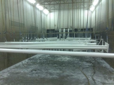 Alle onderdelen waren, na te zijn schoongestraald, gesorteerd op kleur in de spuitcabines opgehangen. Eerst de gele delen...