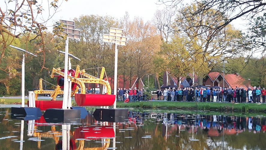 Vanaf 20:30 uur volgde het aanschouwen van het tilproces buiten bij de vijver waarbij de spanning alsmaar toenam totdat de bevrijdende plons vlak na 21:00 uur een vrolijke triomf bij het publiek teweegbracht.