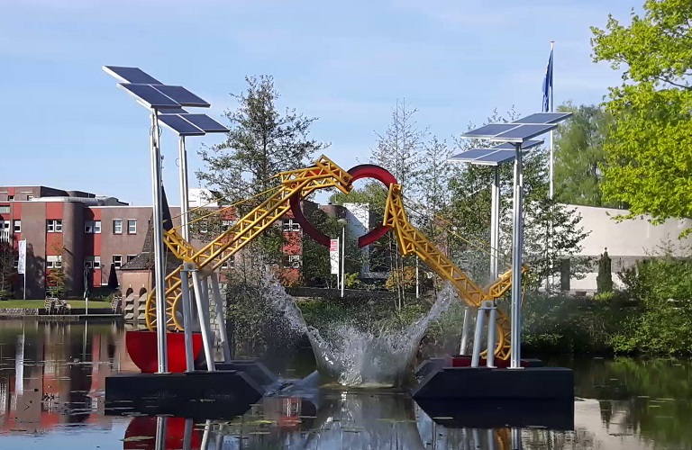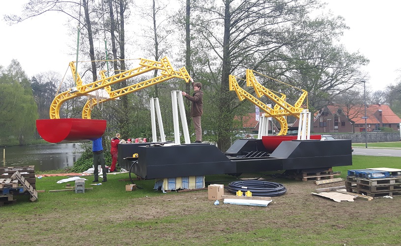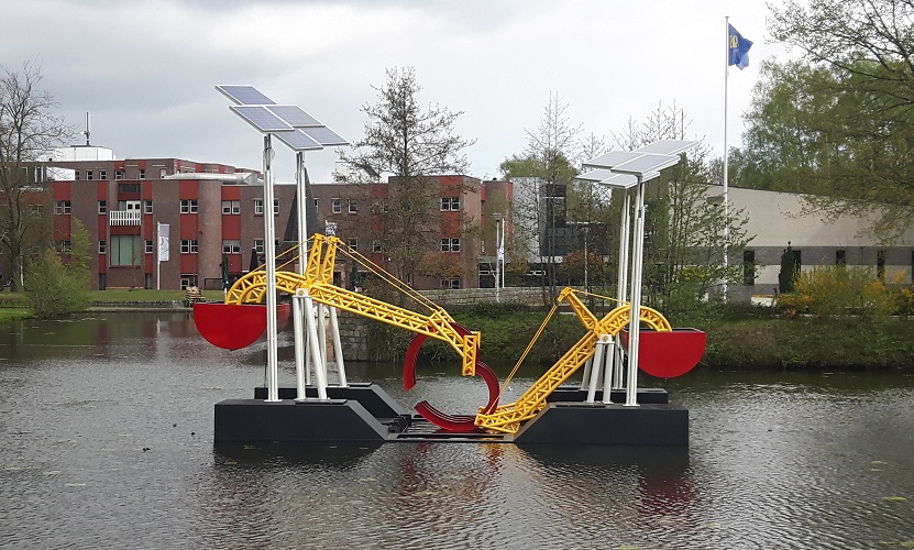 As a preparation for this large kinetic art work a scaled version of the Taaie Tiller of 7 meter long and 4.3 meter wide (lifting 300 kg 3 meter above the water) has been built, which now is permenantly on show at the campus of the University of Twente in Enschede (NL). This 'small' Taaie Tiller is active every day, starting its cycles at 12:45pm and 15:45pm (duration 70 minutes, splash after 30 minutes). You can follow the development on our blog and to see how you can help us, have a look here. A video of a moving model can be found here.